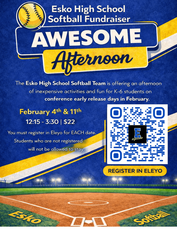 The Esko Softball Team is offering an afternoon of inexpensive activities and fun for all K-6 students on Wednesdays February 4th and 11th. These are both early release days conference days. Families interested in sending their elementary students to the "Awesome Afternoon" must register via Eleyo.
